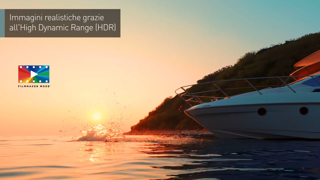 COLORI BRILLANTI, CONTRASTI NITIDISSIMI E DETTAGLI ANCORA PIÙ DEFINITI: DOLBY VISION® INCANTA CON LA QUALITÀ DELLE IMMAGINI. LA FILMMAKER MODE DEFINISCE LA TAVOLOZZA DEI COLORI DEL FILM, IL CONTRASTO, LE PROPORZIONI E IL FRAME RATE PENSATI DAL REGISTA. L'IMMAGINE DI QUALITÀ È IMPORTANTE, MA L'ENTUSIASMO AUMENTA CON L'AGGIUNTA DI UN SUONO STRAORDINARIO. GRAZIE ALL'ELABORAZIONE AUDIO E ALLA TECNOLOGIA IMMERSIVA DOLBY ATMOS®, TI SENTIRAI AL CENTRO DELLA SCENA.